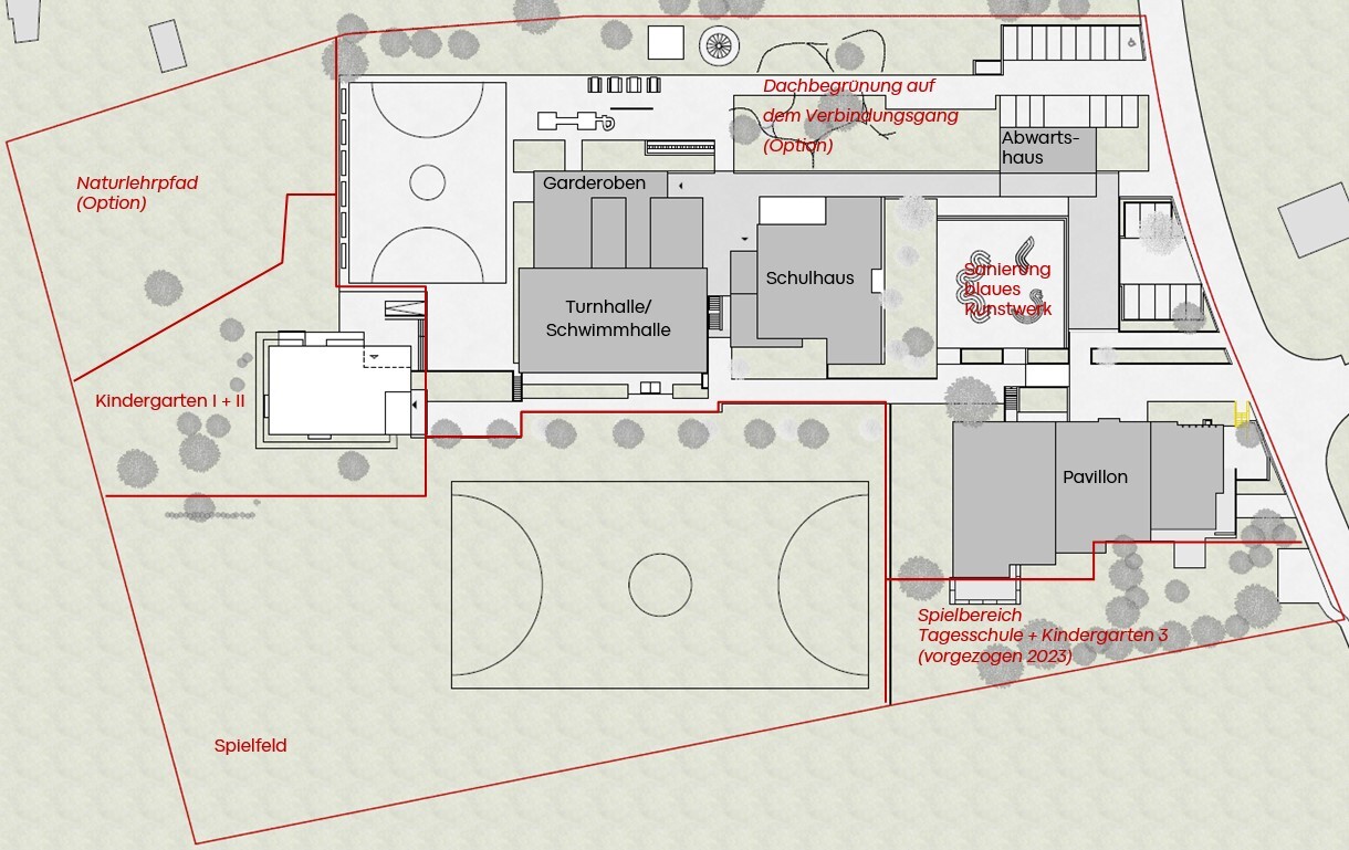 Rund 50 Prozent der heute asphaltierten oder mit Verbundsteinen besetzten Fläche wird entsiegelt. Dadurch verbessert sich das Mikroklima. Weiter ist vorgesehen, als Schattenspender rund 40 zusätzliche Bäume und diverse Sträucher zu pflanzen. Bei der Auswahl der Pflanzen wird darauf geachtet, dass sie dem fortschreitenden Klimawandel standhalten. Eine Begrünung der überdachten Verbindungswege hingegen ist wegen der statischen Bedingungen nicht möglich. Von der neu gestalteten und aufgewerteten Umgebung der Schulanlage profitieren ausserhalb der Unterrichtszeiten auch die Kinder der Nachbarschaft.